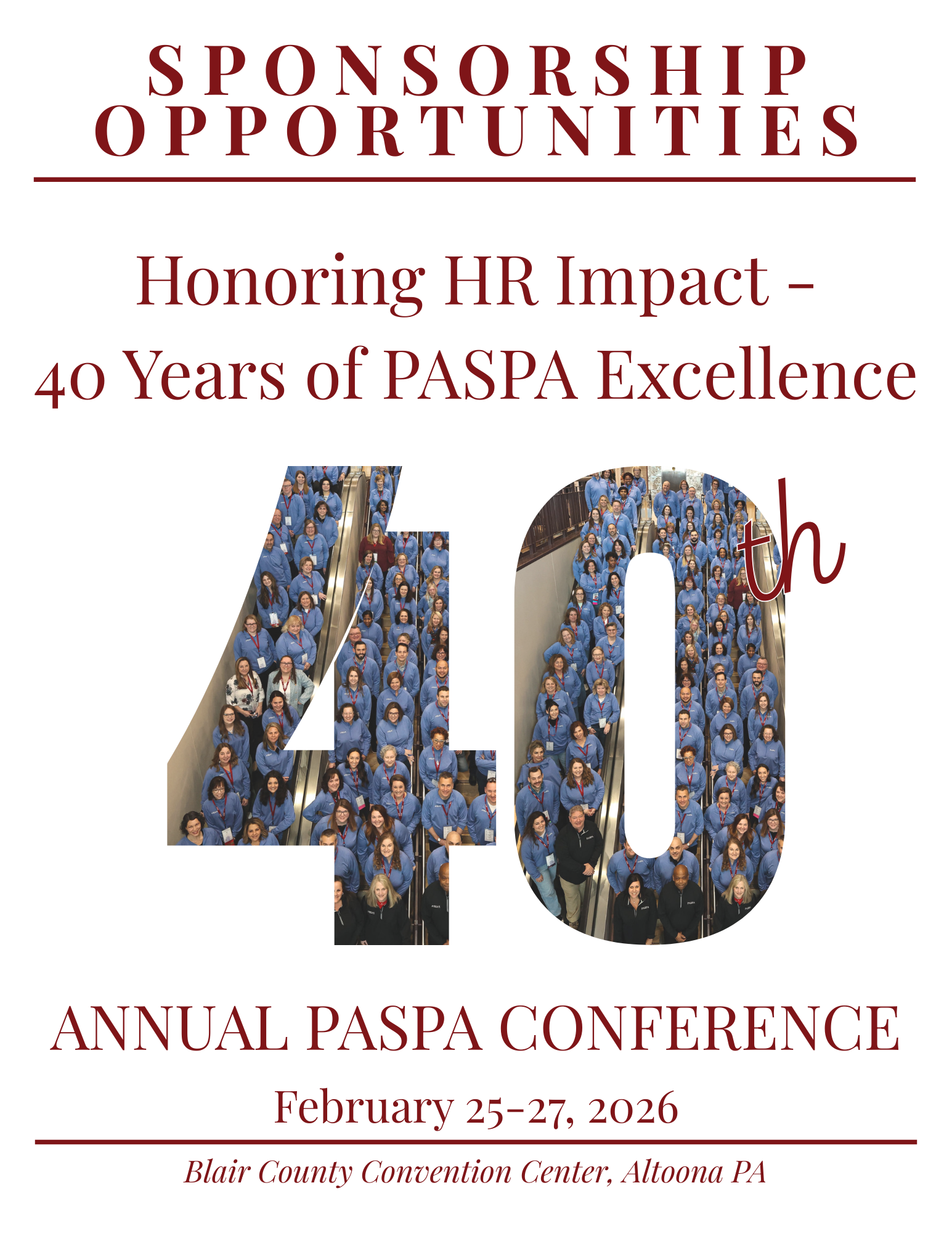 The 40th Annual PASPA Conference will be held on February 25 - 27, 2026, at the Blair County Convention Center in Altoona, PA. Join us as we celebrate PASPA’s 40th Anniversary! For four decades, PASPA has been dedicated to advancing Human Resources excellence in Pennsylvania’s schools, supporting the professionals who shape the success of our districts every day. This year’s conference will honor the incredible impact of school HR leaders, reflect on our shared journey, and inspire the future of our profession.